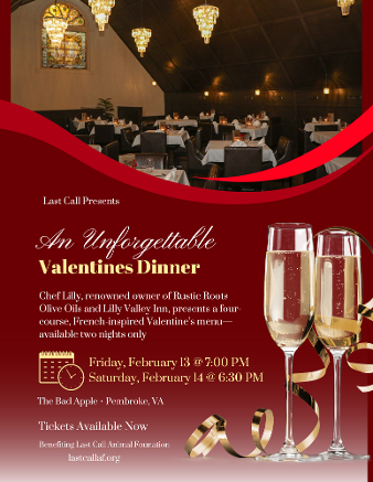 Chef Lilly (Rustic Roots Olive Oils and Lilly Valley Inn) guest chefs at The Bad Apple for two fabulous evenings of romance. She has curated a menu designed to enchant and delight, creating an unforgettable evening for two. Optional wine pairing (award-winning Altillo Vineyards), cocktails and a VIP photo experience are all available. Save the date - tickets go on sale January 13!
